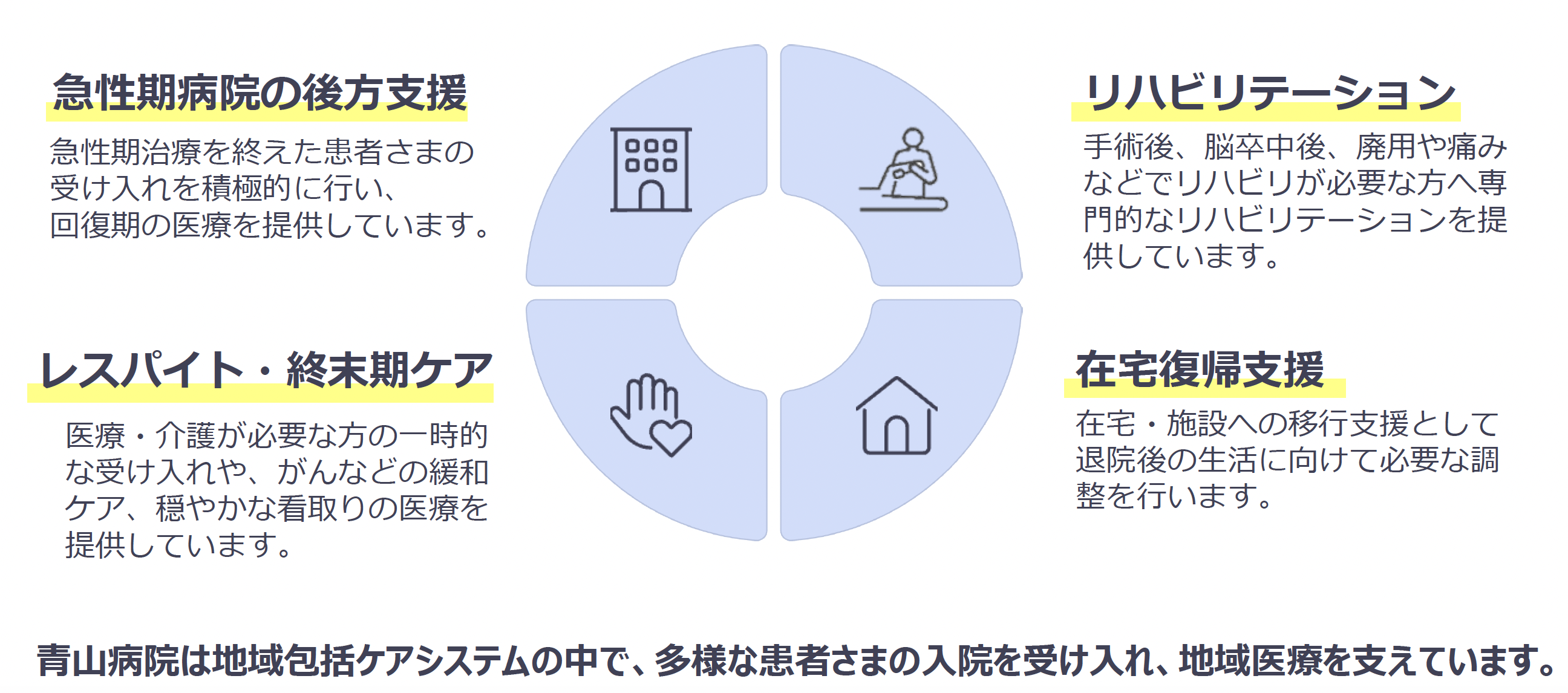 急性期病院と在宅医療をつなぐ“ハブ(HUB)”として、地域包括ケアシステムの中心的な役割を果たしてまいります。
